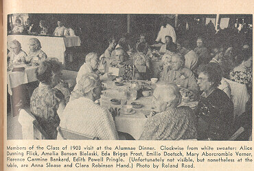 Did you see Alice's picture in the July Quarterly? Our 1903 table was directly back of the 1898 table pictured on page 40. There you wil see facing you Nancy Nulton Larrick on the right end and our class president next to her. And who are those with their backs to us? Left to right are Mary Taylor Reynolds, Jane Hyde, Claire Ackerman Vliet, and Olive Mast Pennegar. Was I ever deflated when I saw that rear view! Those ears! So those are what our church members have to look at, since our family pew is one of the frontest of the front! - Claire Ackerman Vliet.